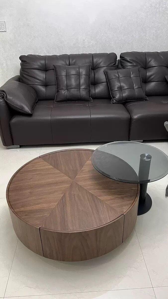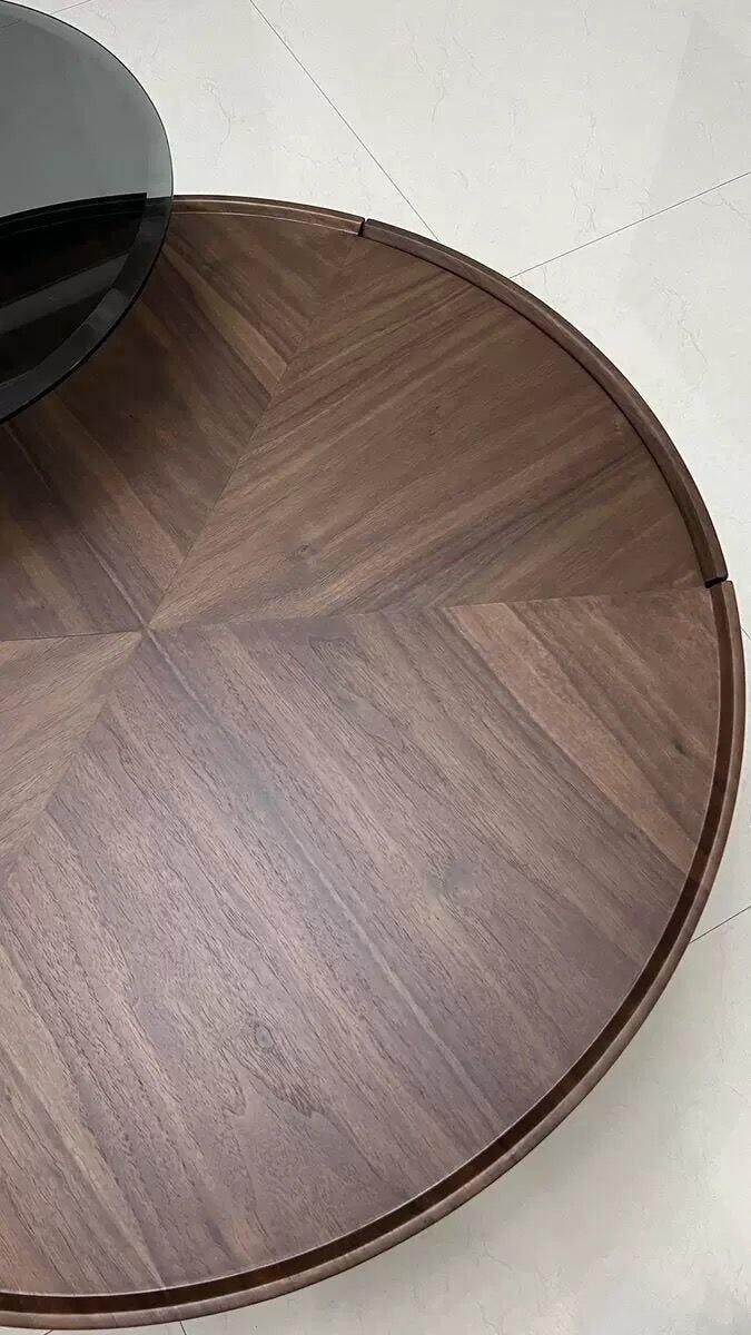 Elevate your living space with the sophisticated ALMANDINE Modern Coffee Table Set, where contemporary design meets intelligent functionality. This stunning ensemble features a large round walnut storage table paired with a sleek glass-topped accent table, creating a dynamic duo that transforms any living room into a showcase of modern elegance. The main table's revolutionary design includes hidden storage compartments seamlessly integrated into its cylindrical base, while the beautiful walnut wood veneer showcases rich grain patterns that bring warmth to contemporary interiors. Perfect for entertaining, daily use, or simply making a design statement, ALMANDINE represents the perfect marriage of form and function.