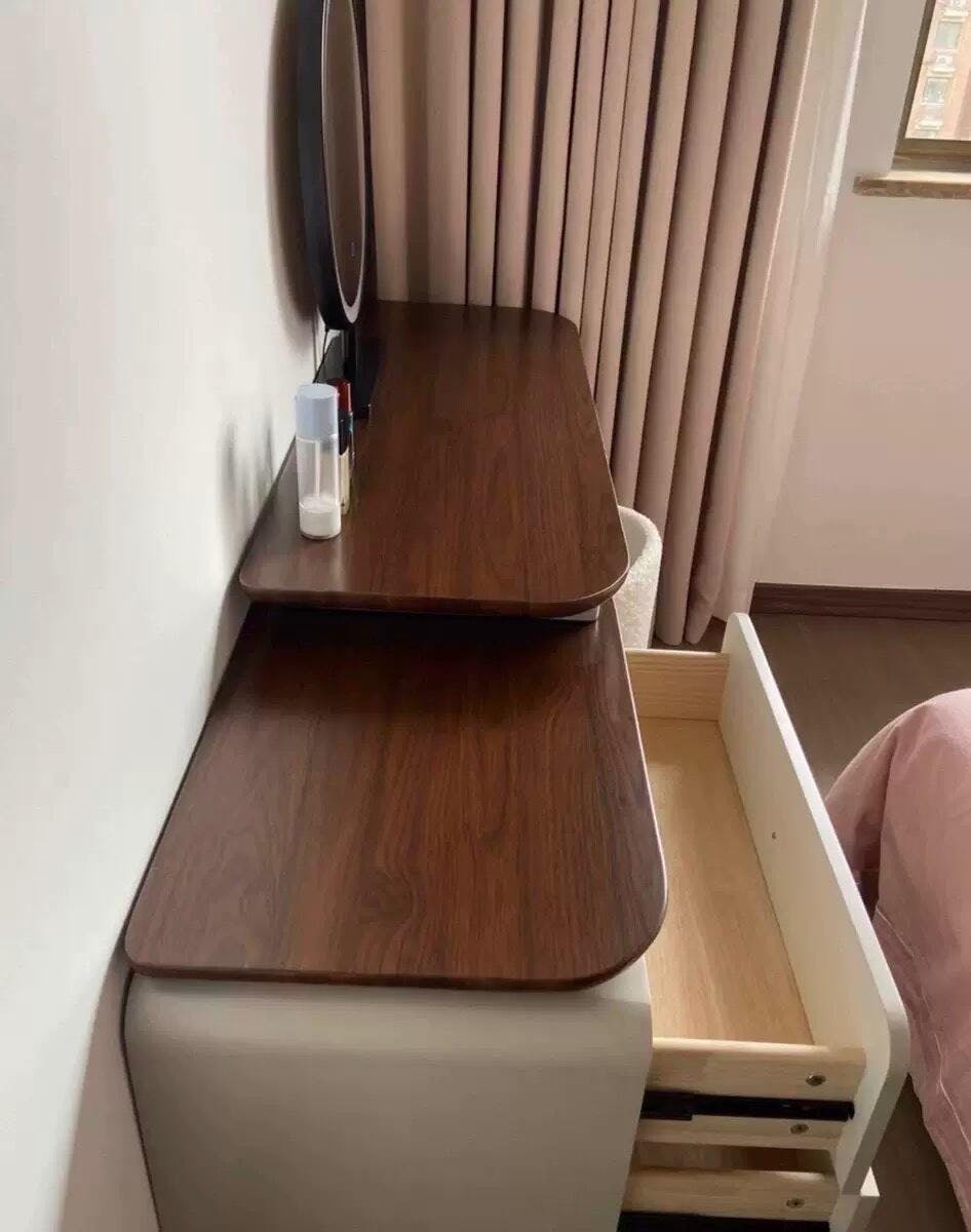 Meet sophistication and functionality with the CORELIA Dressing Table, expertly designed for modern living spaces. This innovative vanity combines sleek engineered wood construction with smart storage solutions, featuring a contemporary dual-tier design that maximizes surface area while minimizing floor space. The warm wood-tone tabletop paired with crisp cream base creates an elegant contrast, while multiple drawer compartments and open shelving keep beauty essentials organized and within reach.